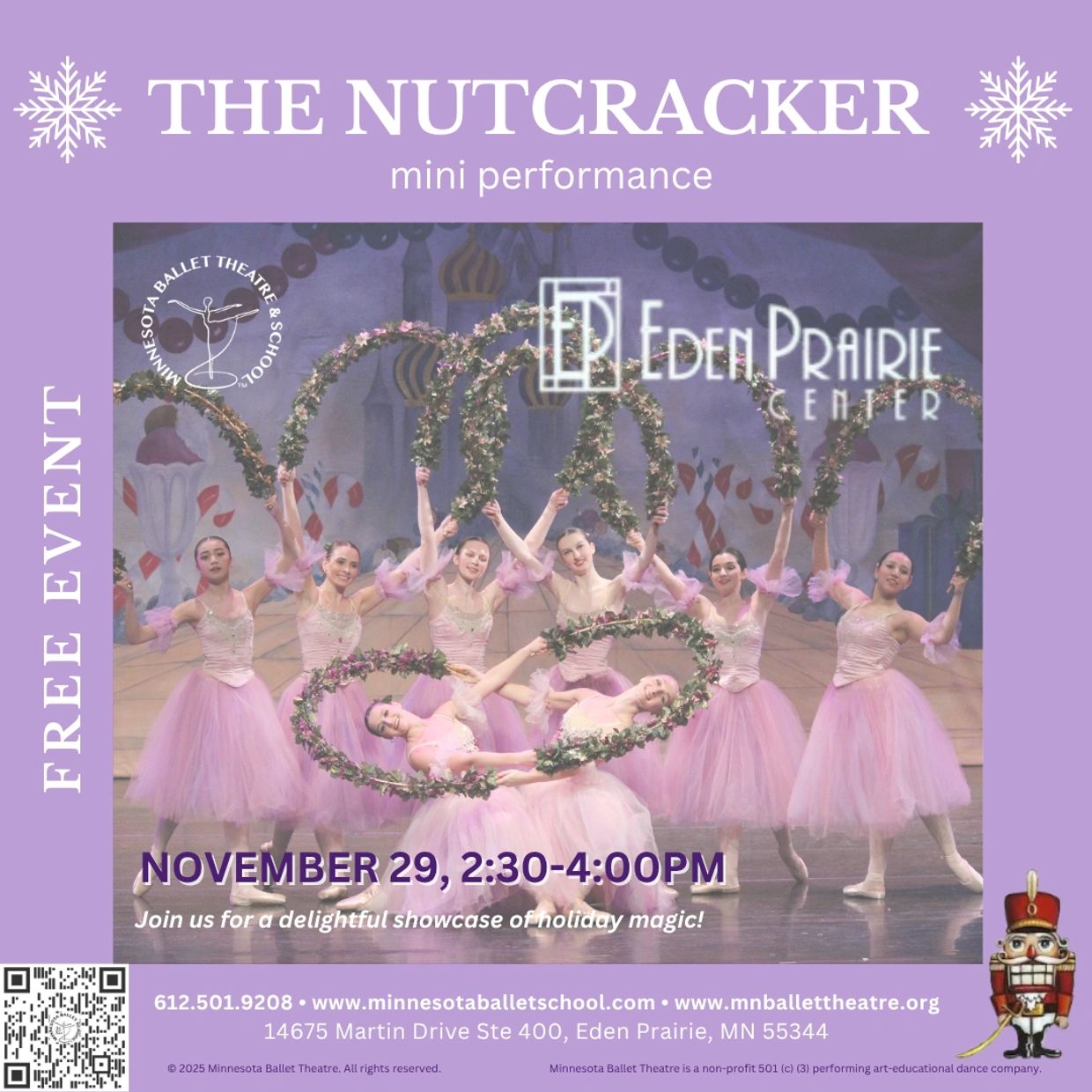 Bring family and friends to share in the joy, beauty, and magic of The Nutcracker at this special event. Don’t miss this chance to see our talented dancers up close, and be sure to catch our full version of the original Marius Petipa Nutcracker on December 12–14 at Eden Prairie High School Performing Arts Center! Join us for an afternoon of unforgettable holiday moments at Eden Prairie Center!