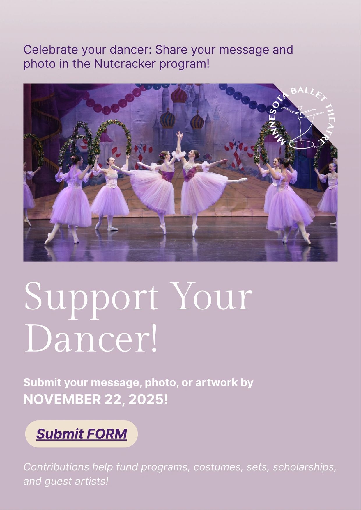 Celebrate your dancer and support Minnesota Ballet Theatre by featuring a personal message or photo in our Nutcracker program! This is a wonderful way to wish your dancer good luck and show your pride while helping bring this holiday tradition to life.
